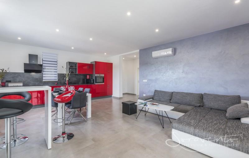 Inside, the villa includes 3 bedrooms and 2 bathrooms, comfortably accommodating up to 6 guests. The living room also includes a fold-out sofa for 2 additional guests, making it an ideal choice for larger groups. The fully equipped kitchen is perfect for preparing home-cooked meals and comes with essential appliances such as a dishwasher, fridge, oven, and washing machine.